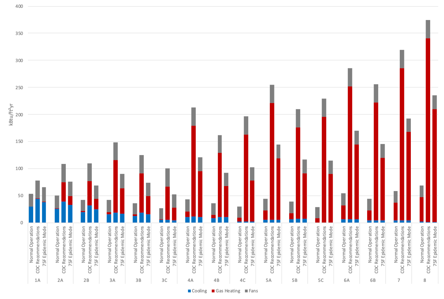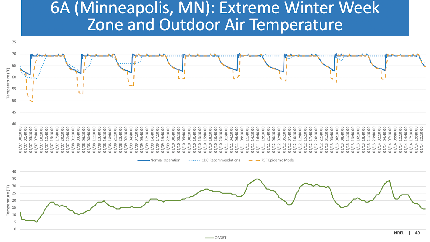 NREL’s study sought to find out how much energy would be required to follow expert recommendations to utilize 100 percent OA — or as much OA as system equipment can handle — all the time. The lab compared these numbers to “normal” HVAC operation, and then to the 75F Epidemic Mode, an HVAC control sequence designed expressly for life during a pandemic.