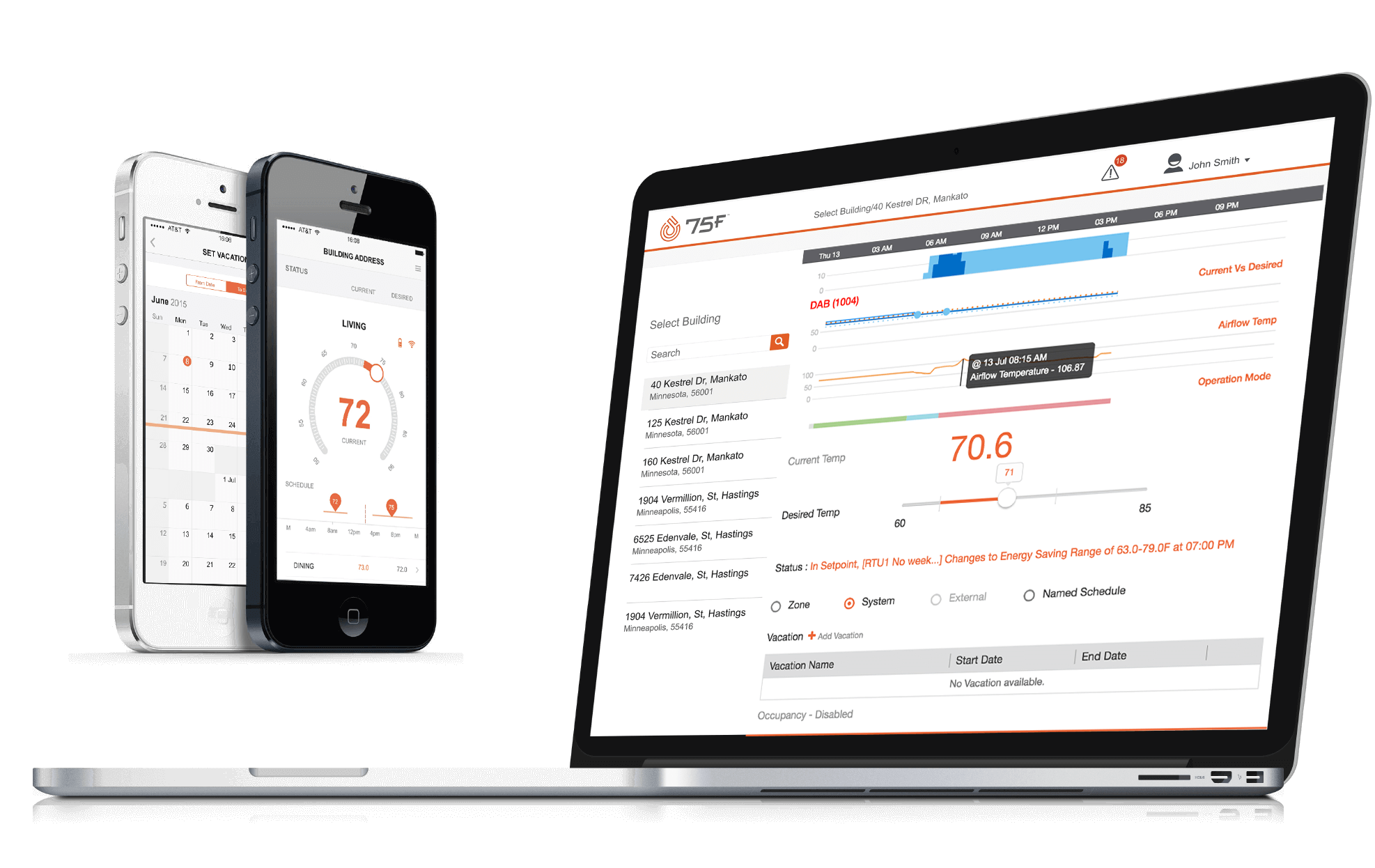 Facility directors have real time access to sensor data and remote control over building parameters through the HyperStat’s integration with Facilisight, 75F’s building intelligence suite of web and mobile apps.