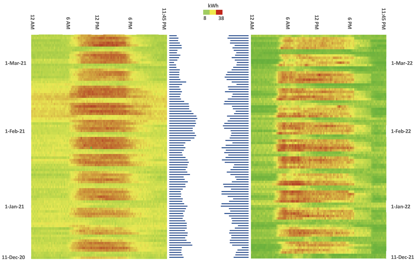 At left:Apple Valley Commons energy use in 15-minute intervals from December 2020 to March 2021, before installing 75F. At right: Energy use in 15-minute intervals from December 2021 to March 2022, after installing 75F. At center:Heating degree day markers demonstrate outside temperatures for energy comparison, with longer bars indicating colder days. Data courtesy of Dakota Electric.