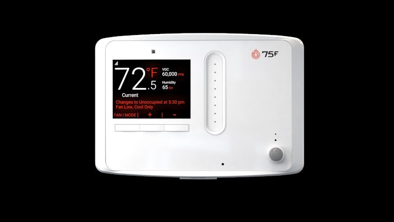 Data from these sensors feed wirelessly into a real-time analytics package and inform 75F’s built-in, Guideline 36-compliant control algorithms. In addition, the HyperStat comes packed with four analog inputs, three analog outputs, and six relays that leverage software-defined control capabilities for all types of standalone multi-stage and modulating packaged HVAC equipment, from PTAC units to heat pumps and fan coils found in commercial buildings. It can also act as the local interface and sensing for VAV controllers.