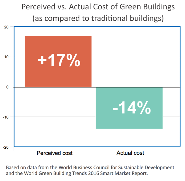 Misconceptions about cost prevent adoption of sustainable buildings are very common. A 2007 opinion surveyby the World Business Council for Sustainable Development found that green buildings were thought to cost 17% more than traditional buildings.