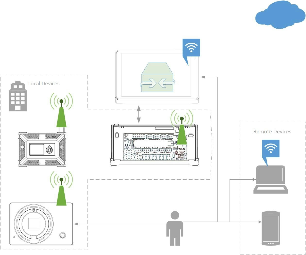 If you want to change the schedule of a zone, you would login to Facilisight from wherever you are and make the change. That change would be routed through the cloud service and down to the CCU where the signal will be converted into a 900 Mhz mesh network communication which will be sent to the zone controller.