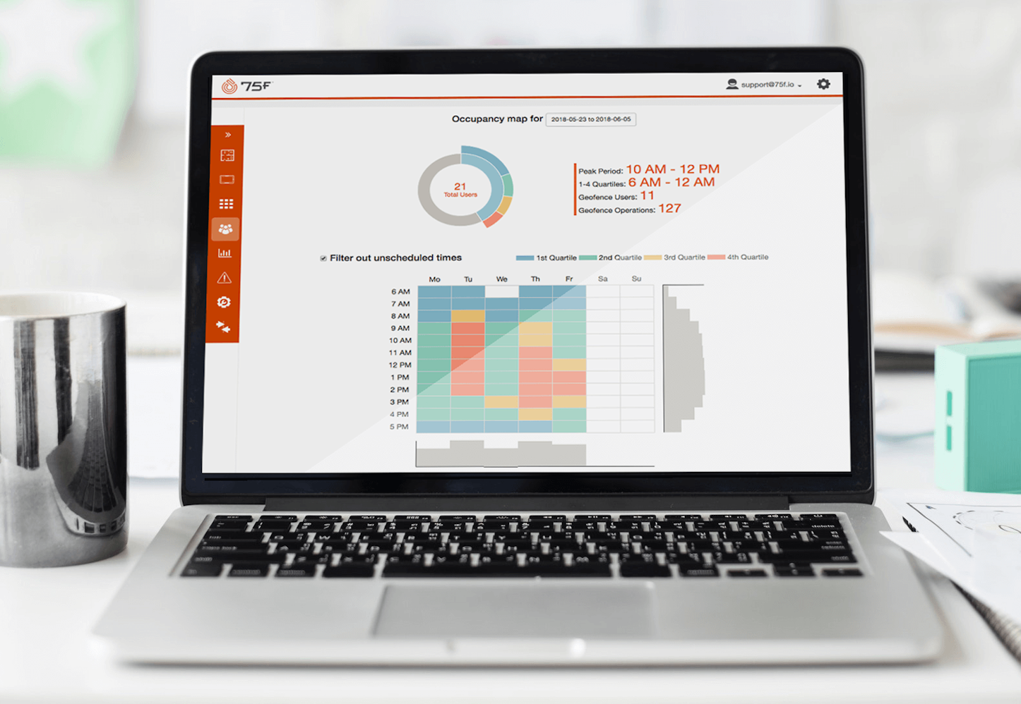 Increase efficiency with the ability to manage your entire system with Facilisight — geofencing capabilities sense arrival and precondition employee zones to match personal preferences. Gain deep insights into building occupancy patterns through the occupancy map and see correlations with indoor environmental conditions from temperatures to CO2 levels to sound decibel levels.