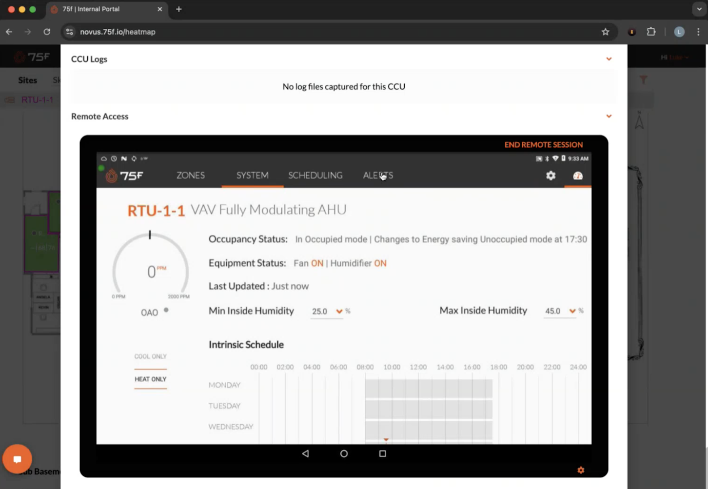 75F’s applications have always been remotely accessible thanks to the system’s cloud-native design. However, as an Android tablet, the Central Control Unit (CCU) has some device configurations that historically have only been accessible manually. This includes actions like password monitoring or troubleshooting tablet errors.