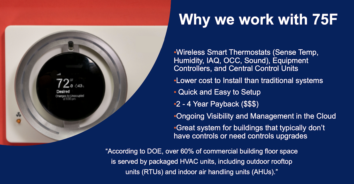 The 75F solution addresses those factors and makes applying strategies at scale more accessible, Moser and Smith point out in this webcast — installations are fast; ROI is disruptive; and remote, portfolio-wide visibility and control makes implementation accessible.