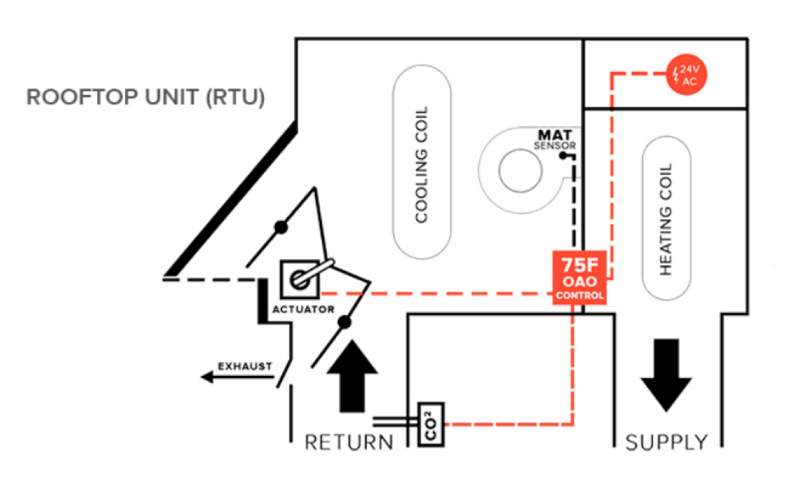 Demand Control Ventilation (DCV) is a control strategy in which we only open the outside air damper when IAQ demands it, based on CO2 levels measured in the return air system. The outside air damper is kept nearly closed (well below the minimum of 20-30% outlined above) most of the time. Only if the CO2 levels rise is the outside air damper opened to reduce them. If CO2 levels are low (say because the building is only partially occupied), DCV can save a lot of energy when the outside temperature is cold as it does not require you to heat that outside air up to 72°F. The same principle enables DCV to also save energy in hot, humid weather.