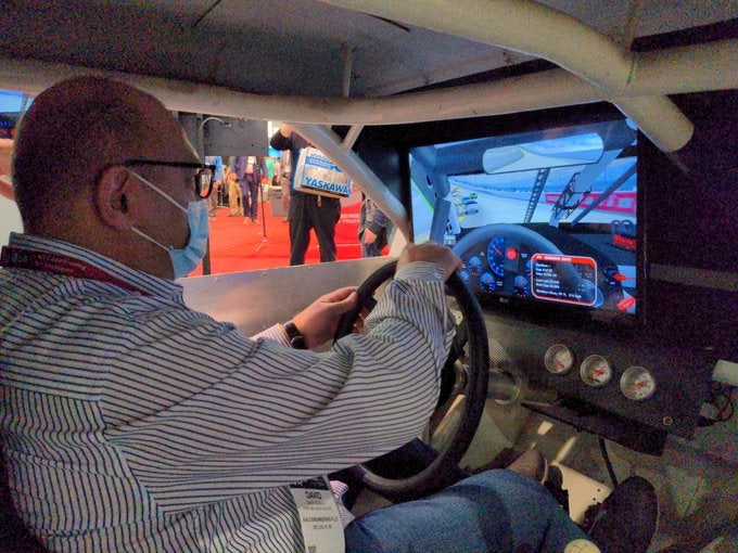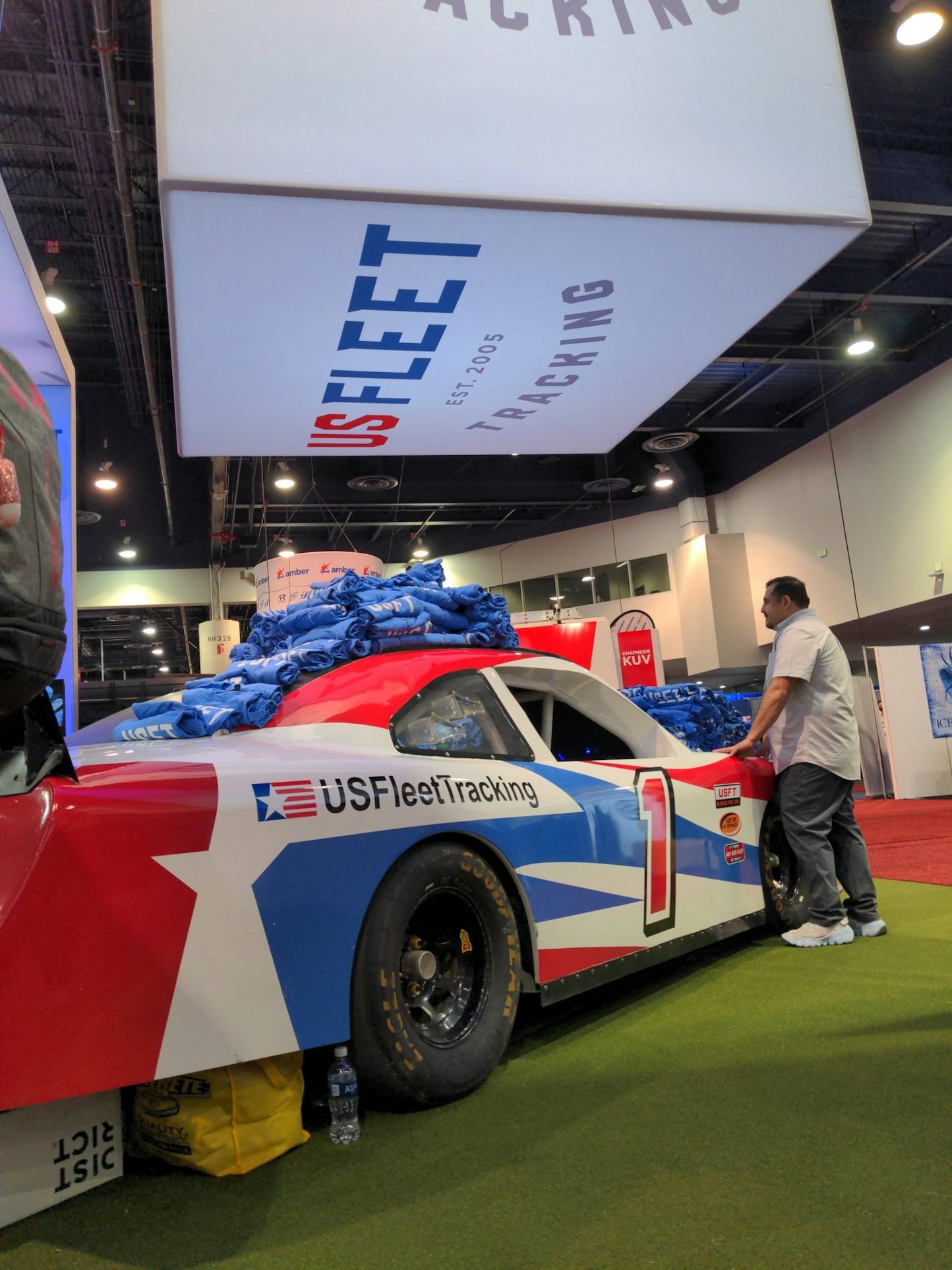 12:43 PM: "@USFleetTrackingbrought a car and driving simulator! The fastest lab each day gets two tickets to an NASCAR event anywhere in the country! @ahrexpobooth 11314, stop by and win. 17 seconds is the current Bristol motor speedway lap record. #AHRLive"
