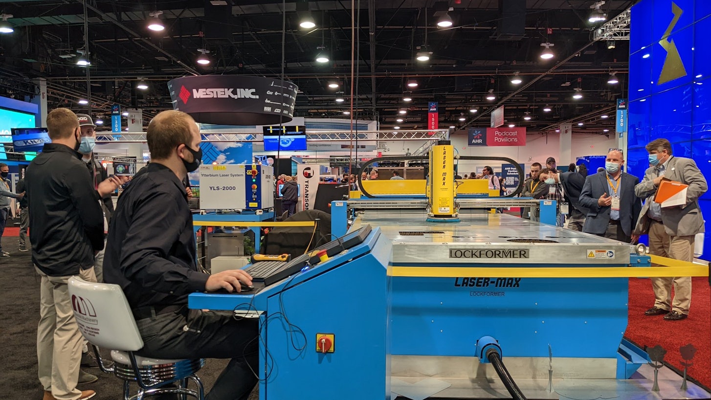 2:04 PM: "It's always so cool to see a live demo of product. @MestekMachinerythey are showing off their Laser Max. Surprisingly very quiet. #AHRLive#ahrexpo2022"