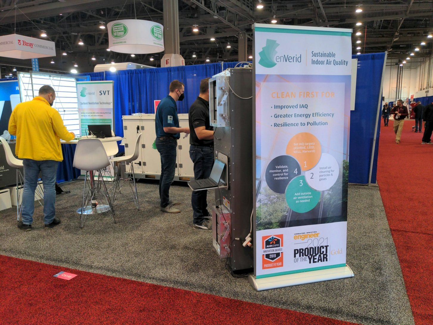 12:08 PM: "@enveridhere at #AHRExpohas huge crowds looking at their indoor air scrubbing technology. The system captures CO2 and VOCs to increase air quality and energy savings simultaneously. @ahrexpo#ahrexpo2022"